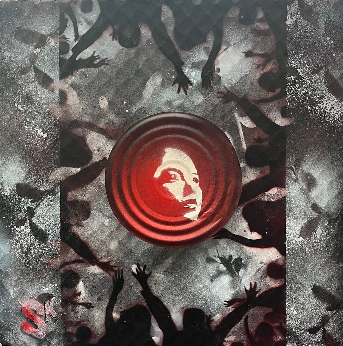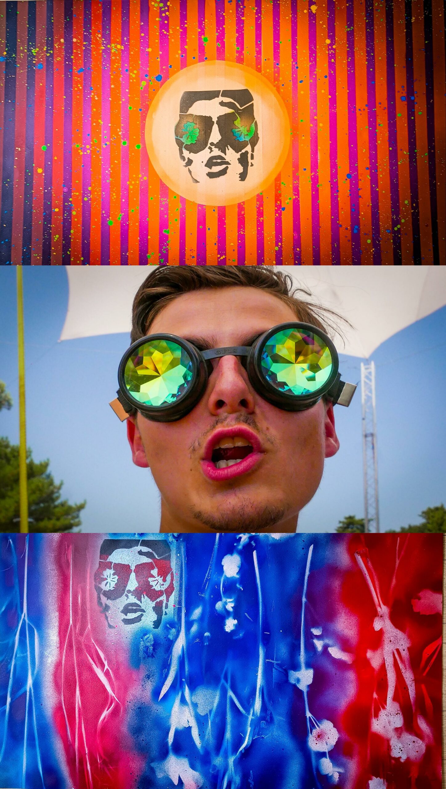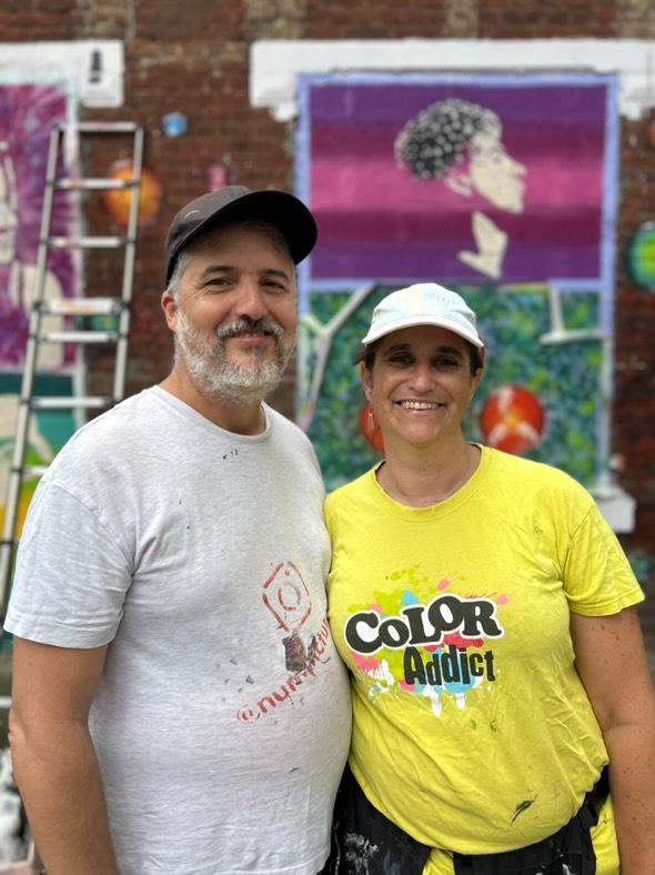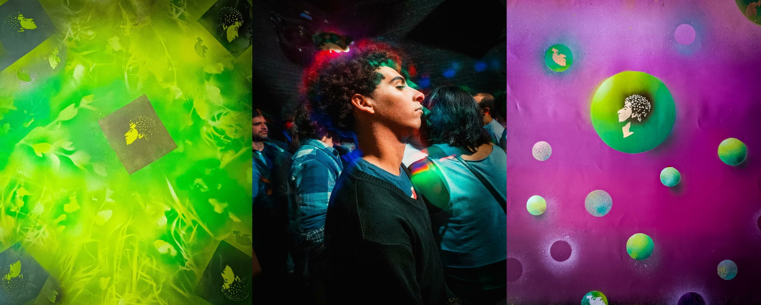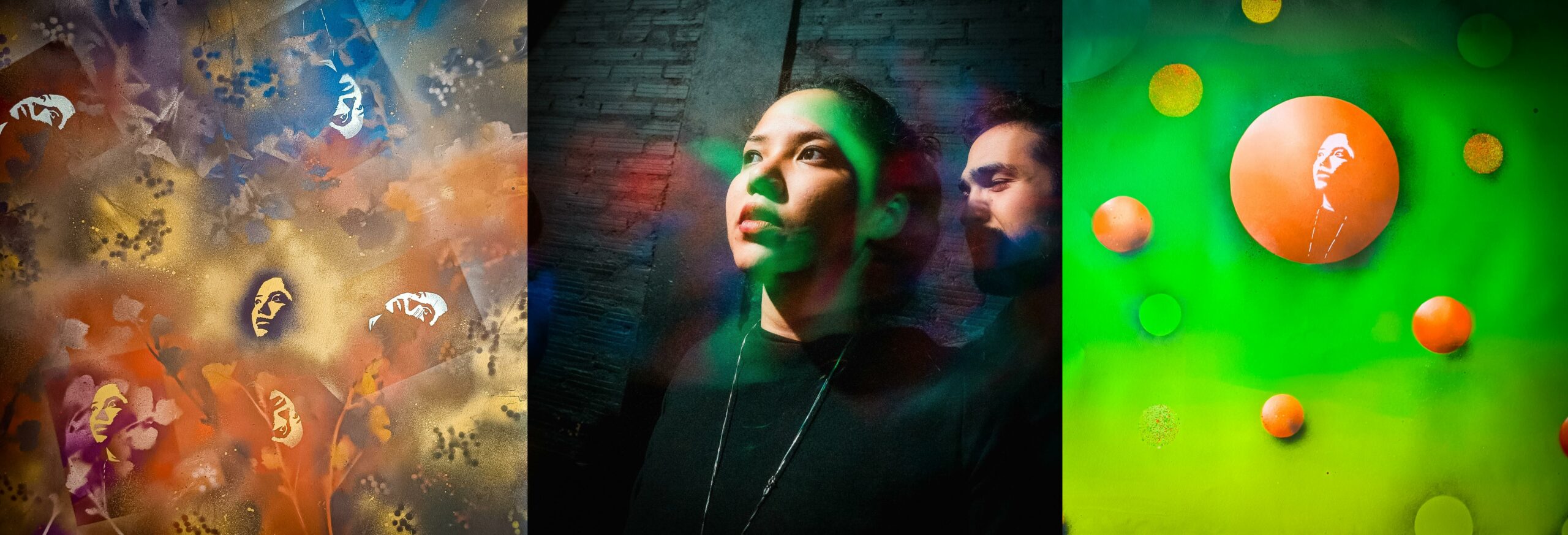 Ensemble, ils associent des fonds graphiques réalisés à la bombe, inspirés de la photographie et des pochoirs découpés à la main pour créer des compositions colorées. Les personnages deviennent alors des icônes urbaines, saisies lors d’un instant suspendu.