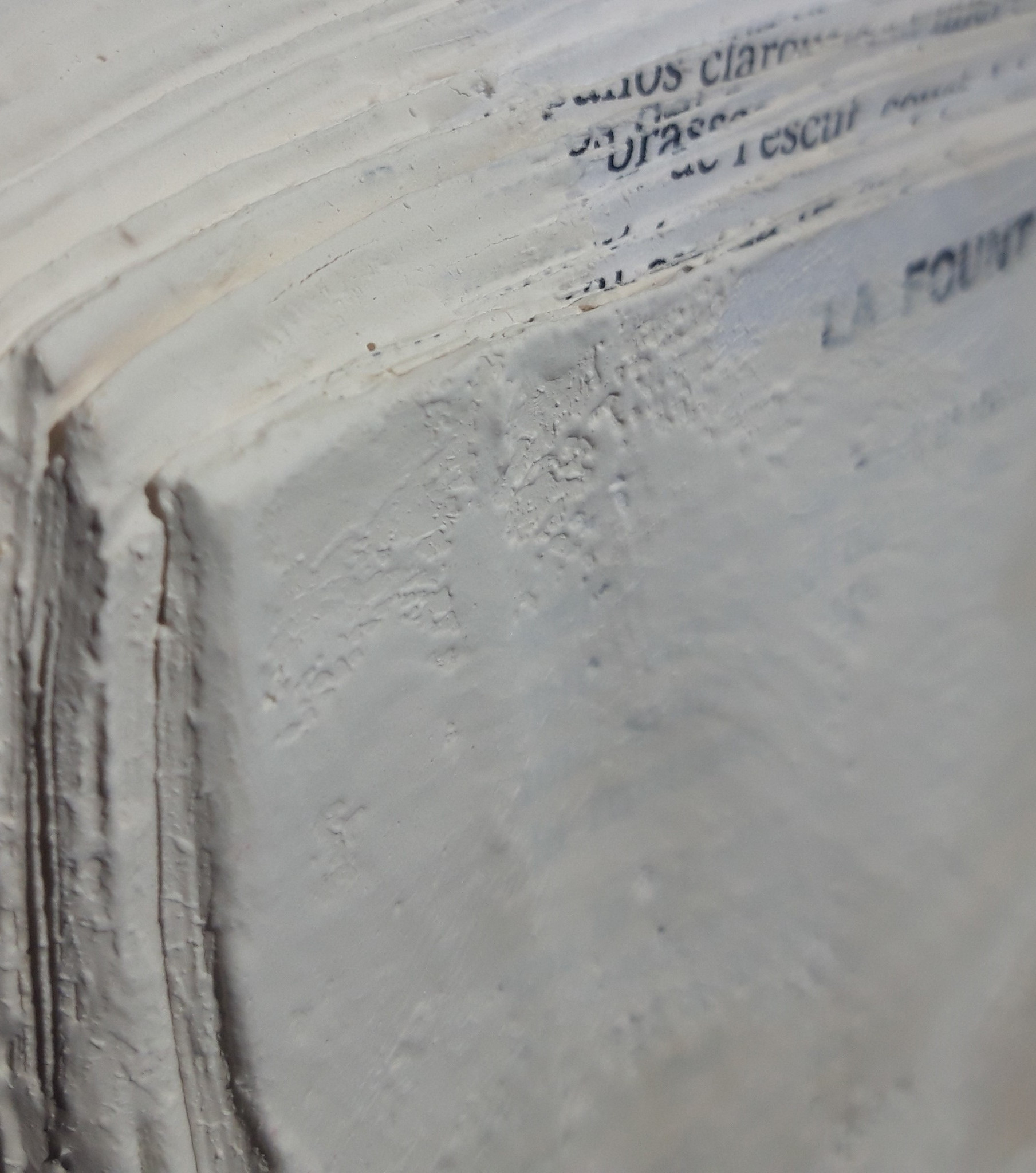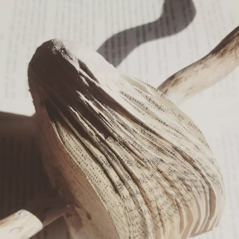 Text-ures, techniques mixtes « Boîte à livres, tous ces livres… cette sensation d’overdose générale depuis que j’ai dû quitter le désert où je vivais. Le souvenir d’un caricature à propos d’un flyer diffusé pour dire qu’il faut arrêter de couper trop de bois pour faire du papier..aporie..au delà de la considération écologique, ce sont les modes de la société sédentaire qui sont mis à découvert. Et c’est munie d’une compulsion vitale qu’il fallait métamorphoser ces livres, redonner sens à cet ensemble de mots et de fibres. Commençant à découper les livres,j’y retrouvais la joie de la texture du bois. Elle me guida. Le bois devenu papier redevient bois. Les mots, selon le volume découpé, deviennent cernes de bois.